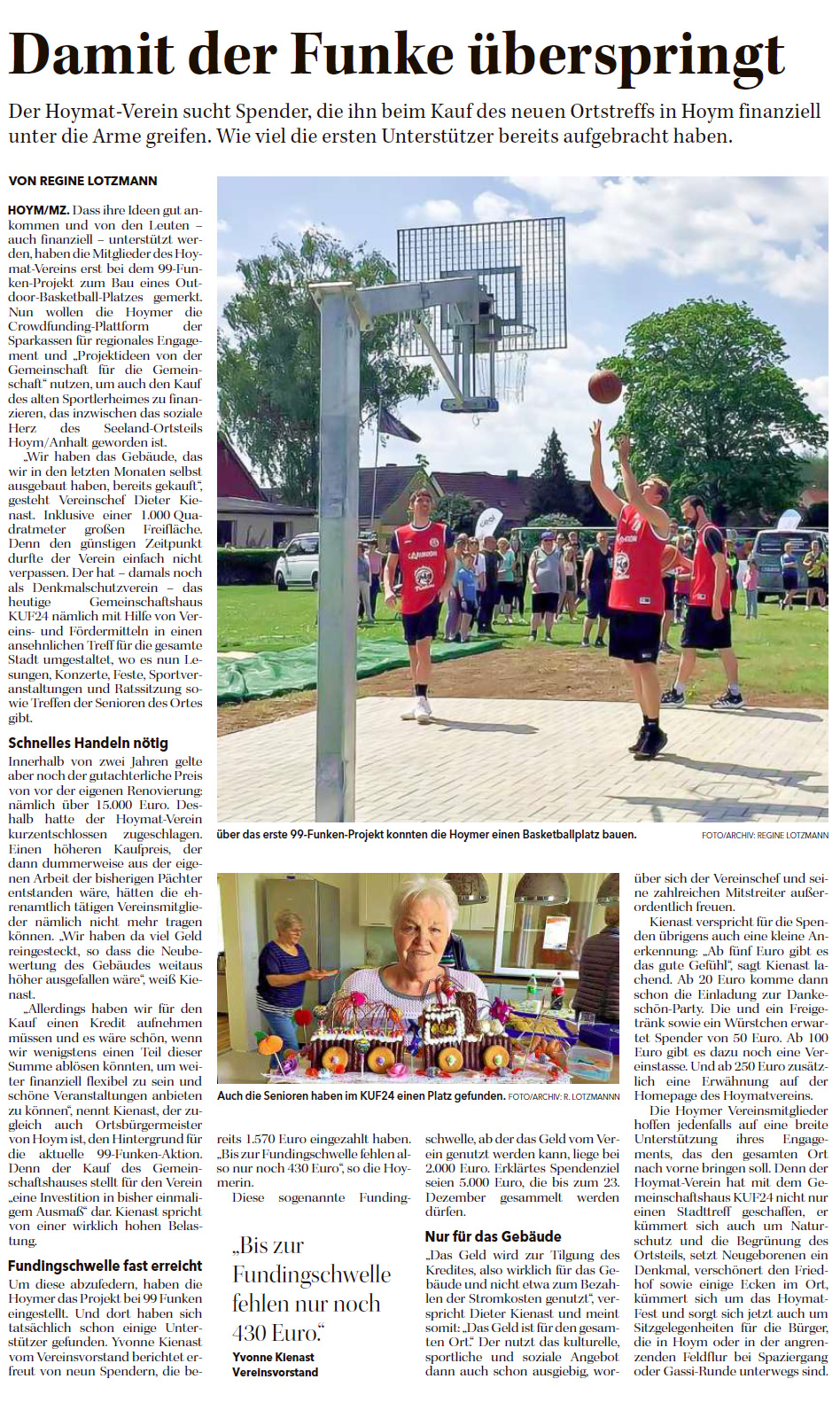Unser Projekt „Erwerb Gemeinschaftshaus“ bei 99 Funken war erfolgreich und spannend bis zum Schluss.