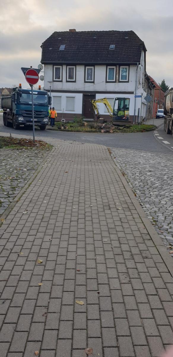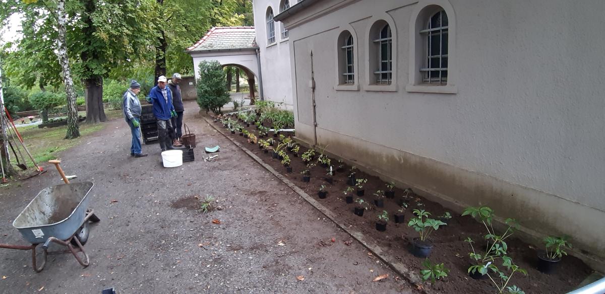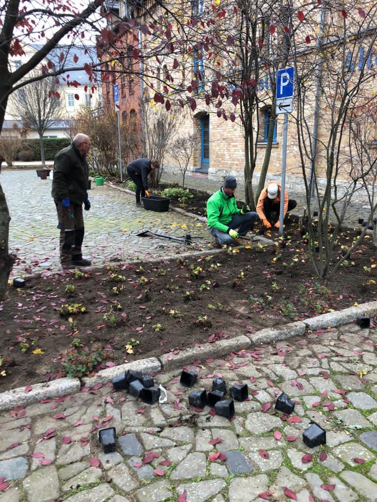 Dieser Antrag wurde positiv beschieden und so konnte im Herbst 2019 mit der Fällung der vertrockneten Bäume und Büsche und mit dem Bodenaustausch durch eine ortsansässige Fachfirma begonnen werden. Es wurde eine Unkrautvlies eingelegt und die Fläche mit Kalksplitt abgedeckt. Die Pflanzung der Stauden führten wir gemeinsam mit unseren Mitgliedern durch.