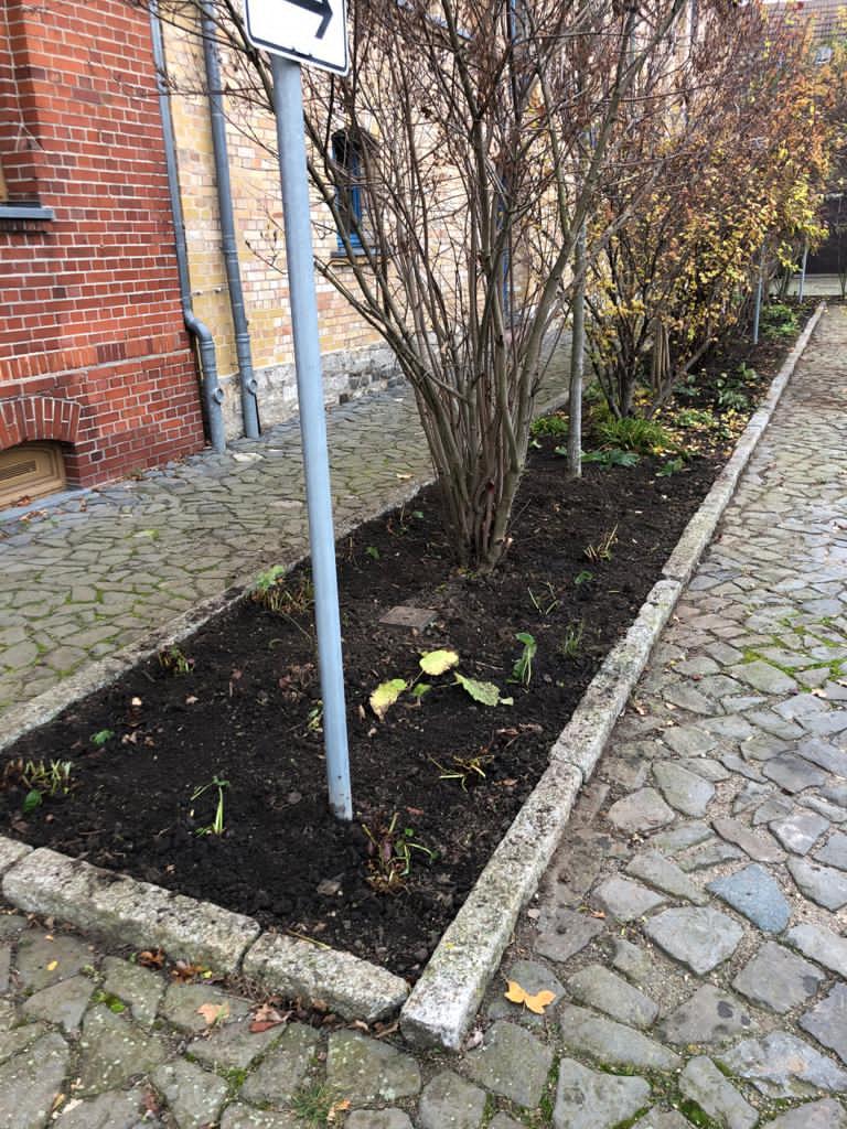 Hier wurde ein insektenfreundliches und pflegearmes Staudenbeet in Zusammenarbeit mit der Begegnungsstätte und dem Denkmalschutz Hoym e.V., ermöglicht durch Spenden, angelegt.