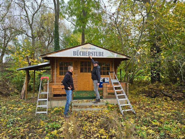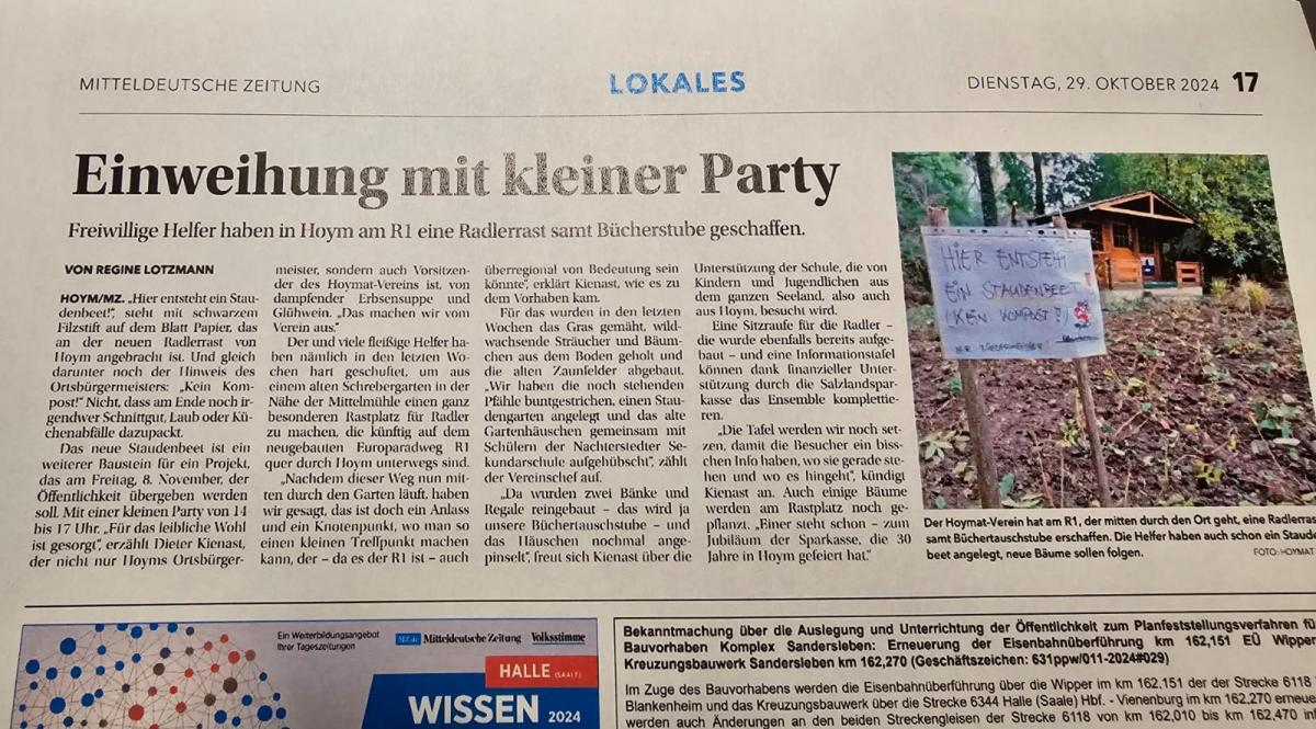Nachdem im Herbst 2025 der R1 in Hoym saniert und umverlegt wurde, konnten wir ein schon lange in der Schublade liegendes Projekt verwirklichen. Aus einem ehemaligen Nutzgarten wurde kurzerhand eine Radlerrast mit Sitzraufe, Infotafel und Bücherstube. Zuvor waren einige Arbeitseinsätze mit ehrenamtlichen Helfern notwendig.
