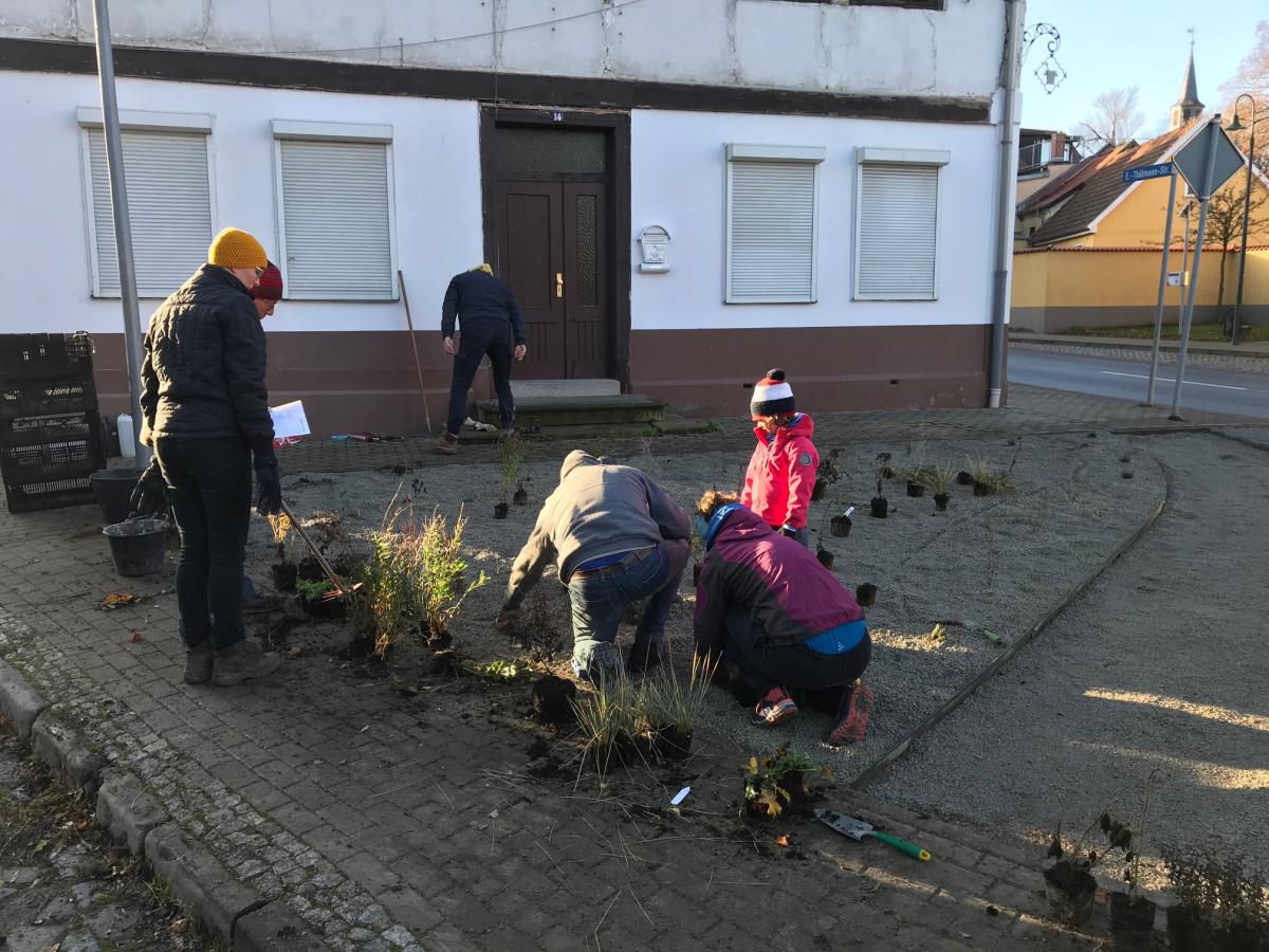 Dieser Antrag wurde positiv beschieden und so konnte im Herbst 2019 mit der Fällung der vertrockneten Bäume und Büsche und mit dem Bodenaustausch durch eine ortsansässige Fachfirma begonnen werden. Es wurde eine Unkrautvlies eingelegt und die Fläche mit Kalksplitt abgedeckt. Die Pflanzung der Stauden führten wir gemeinsam mit unseren Mitgliedern durch.