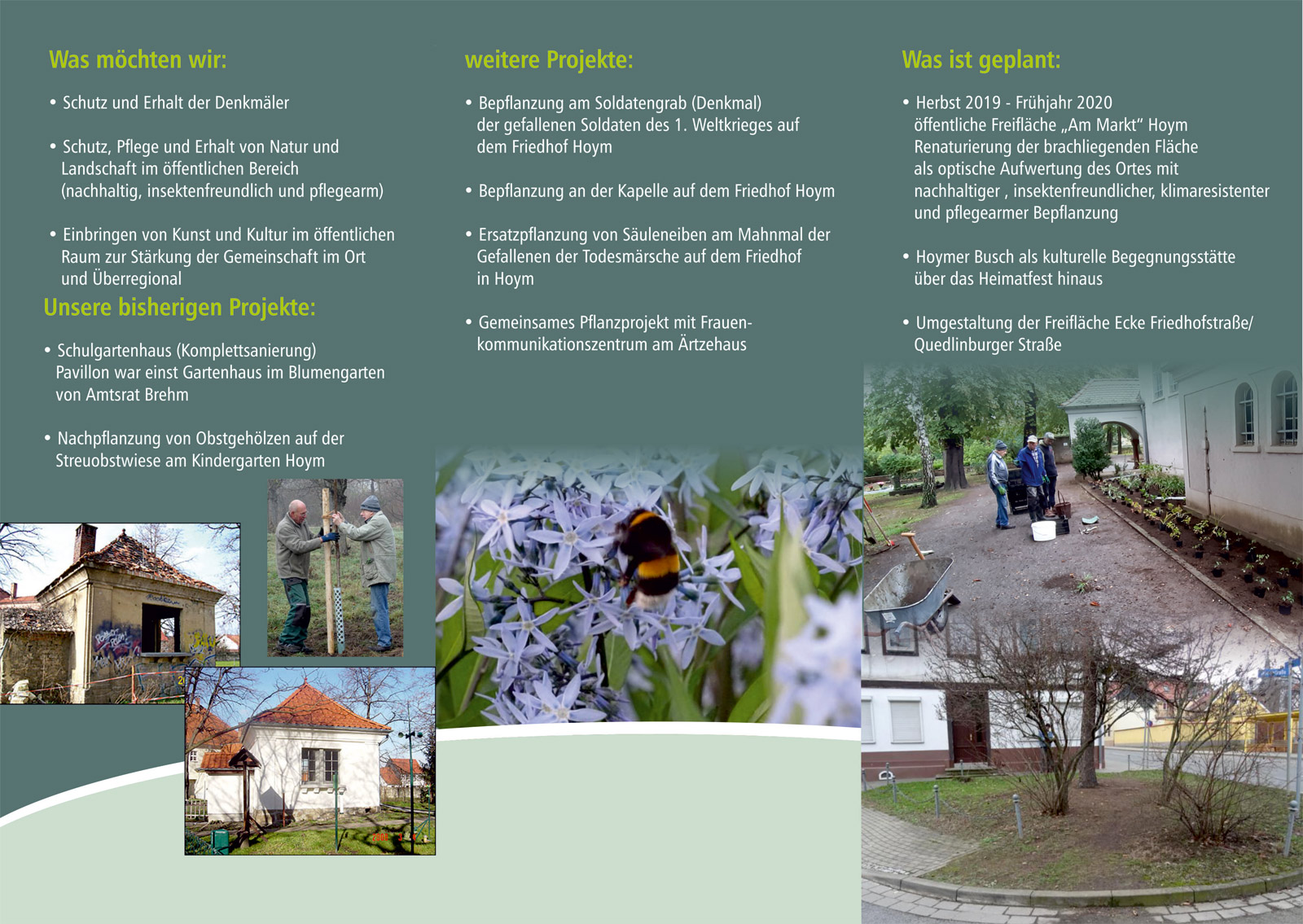 Freianlagen HoymDie verschiedenen Freianlagen u.a. am Schlossplatz, Ärztehaus, auf dem Friedhof neben der Kapelle, das Mahnmal und das Soldatengrab, eine bienenfreundlich gestaltete Freifläche am Markt, und die Fläche am Mahnmal in der Wasserstraße pflegen wir seit ein paar Jahren zusammen mit unseren Seniorinnen der Begegnungsstätte.